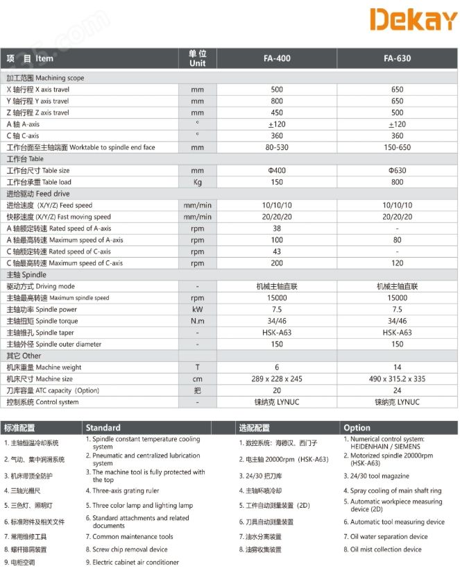 FA-400五轴高速加工中心技术参数: