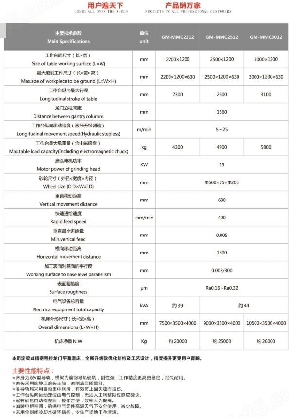 GM-MMC2212定梁式精密程控龙门平面磨床技术参数: