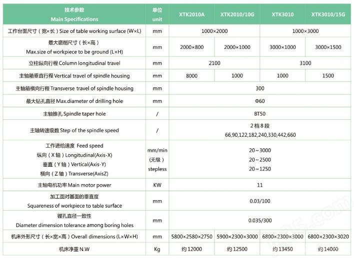 ●立柱纵向移动、工作台落地固定式结构布局,工件承载能力强,占地面积小。