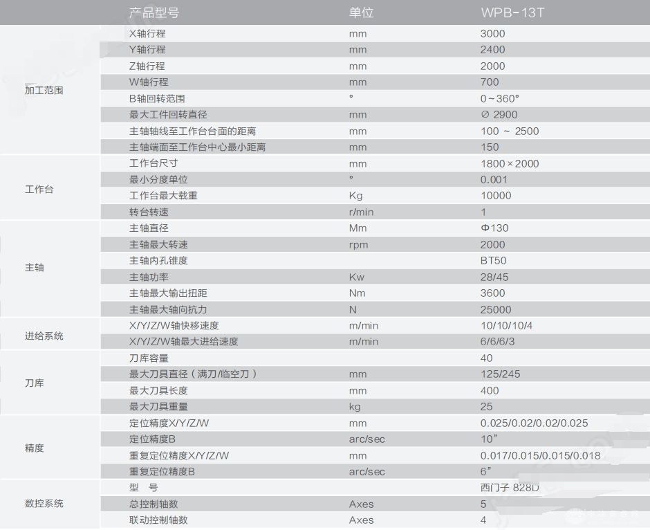 2.配置40T断轨式机械刀库,可实现机床快速换刀,提高机床加工效率, 由大功率油冷却机对主轴轴承及主传动系统齿轮进行冷却,以减少主轴热变形,保证机床的加工精度, X、Y、Z、W、B轴均采用西门子交流伺服进给电机驱动。