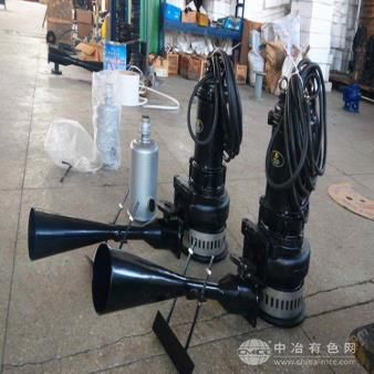 喷射式曝气机通过潜水泵产生的水流经过喷嘴形成高速水流,在喷嘴周围形成负压吸入空气,经混合室与水流混合,在喇叭形的扩散管内产生水气混合流,高速喷射而出,夹带许多气泡的水流在较大面积和深度的水域内涡旋搅拌,完成曝气,并且其轴功率不随潜没深度的变化而变化,进气量可以调节。正因为如此,潜水射流曝气机可以在水位变化较大的池中应用。
