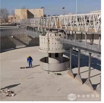 污水从池中心的进水管经导流筒扩散后,均匀地向周边呈辐射状流出,呈悬浮状的污泥经沉淀后沉积于池底,上清液通过溢流堰板由出水槽排出池外,污泥刮板将沉于池底的污泥由池周刮向中心集泥槽,依靠池内水压通过排泥管排出池外。主梁在周边驱动装置的带动下,以中心旋转支座为轴心沿池顶以~2.0m/min(至刮臂外缘以1.5m/min~3m/min)线速度行驶,主梁下部连接支架、污泥刮泥板等。近液面处设置浮渣刮板(根据工艺设计,可选),沿中心稳流筒延伸至浮渣斗,当主梁旋转时,浮渣刮板将液面的浮渣由池中心撇向池周,收集在浮渣斗,通过浮渣斗,排至池外。