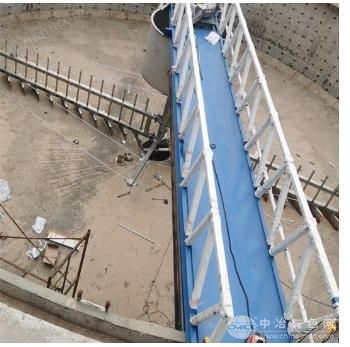 主要由主梁、中心支座、传动装置、吊架、刮泥装置、刮板、稳流筒等部件组成。由池中心的支墩和池沿上行走的车轮支承主梁,主梁的一端与在中心支墩上的中心支座铰接,另一端与装有包括减速机在内的传动装置联接。该机以支墩上的中心支座为轴沿池圆周作回转运动。在主梁下部装有刮集装置,底部的刮泥板将池底的污泥刮到池中心的排泥槽内,再由*下端的小刮泥板随刮泥机转动将排泥槽污泥搅动防止板结,污泥经排泥管排出池外。