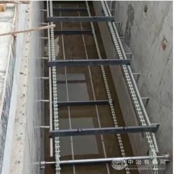 链条式刮泥机是一种刮泥设备,可适用于矩形初沉池与二沉池内表面撇渣与底部刮泥操作,以及各种池体形状的表面撇渣,近几年来在水处理行业中已得到广泛应用。该设备主要由刮泥板、链条、链轮和驱动装置等组成。驱动电机、减速机输出扭矩经过驱动链和链轮传送到刮泥机主轴,主轴链轮驱动铺设于沉淀池两侧的链条做回转运动,刮泥板两端分别安装在两侧的链条上,由从动轮及导轨支撑,去程于池底刮泥,回程于池面撇渣。
