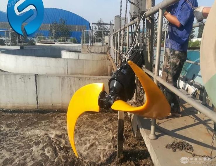 低速推流器,在水处理工艺流程中,广泛应用于氧化沟推流,各类生化池的搅拌,同时也可用于河流防冻,景观水循环等。低速 推流器由潜水电机、减速装置、叶桨和安装系统等组成。其特点是配套 功率小(1.5~7.5kW),转速低(36~135r/min),叶桨直径大(1000~2500mm), 低速旋转,产生大体积流场,服务范围广。后掠式香蕉型叶桨设计,具 体自洁功能,采用聚氨脂或铝合金材质精铸成型,具有重量轻、强度高、 耐腐蚀等优点,其优异的摩擦性能,可保证在低转速的运动状态下与液 体产生良好的阻尼效果,从而创建出柔和的水流。该系列产品除了具有 推流和创建水流的作用外还具搅拌功能。