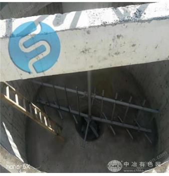 6、耙架由两个大耙和两个小耙组成十字形,与稍呈圆锥形的池底平行。耙架与竖轴用十字头固定连接,竖轴上的轴承为向心和推力轴承的组合,用润滑脂肪润滑。水下为滑动轴承,由尼龙衬套等组成,用压力清水润滑。