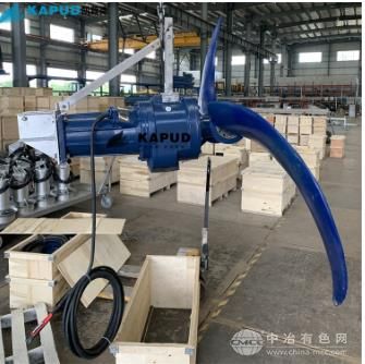 厌氧池搅拌潜水推进器俗称:潜水推流器,低速潜水搅拌机,低速潜水推流器,水下推进器,水下推流器通过电机、减速箱带动叶轮(两叶镰刀式)旋转,产生强烈的推流和搅拌作用,在推动液体前进的同时,对氧化沟(或其它水处理设施)里的混合液进行充分搅拌混合,不仅改善了氧化沟的水流条件,使水体获得工艺所要求的流速,也增加了池底水体的流动和混合,防止污泥的沉积,提高了污水处理效率。