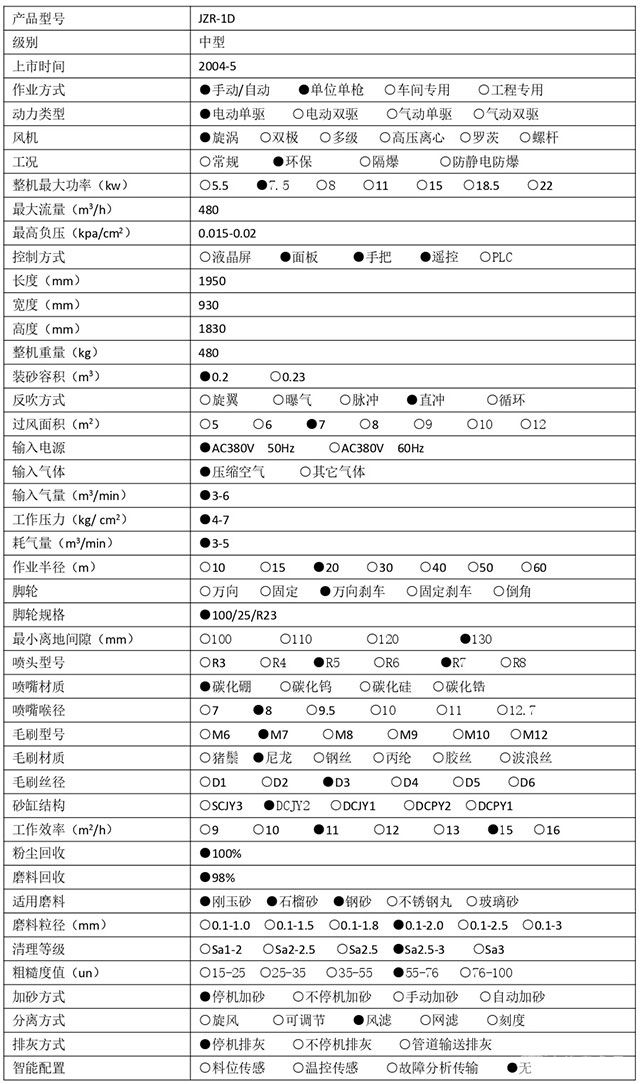 该机应用于民船修造、轨道交通、桥梁、水利、矿山、冶金、油田管道、储罐、车辆制造等领域。装备制造车间表面专业处理工艺,中小型船体压水仓内祛除有毒害涂层喷砂、船坞内仓无尘喷砂除锈、储油罐内外壁除锈、 风电塔筒内外壁喷砂、桥梁防腐、水利工程闸门、城市街道护栏等前处理。是修补抛丸机、喷砂房漏喷工件和大型钢板、工字钢、不锈钢件等金属结构件表面涂化前除锈、除氧化皮、除漆、除污垢、强化表面理想的清理设备之一,该机与JZR-1DH是同属一个级别,工作效率仅次于JZR-1DT型设备。作业半径次于JZR-2D 型。(查看喷砂机视频)