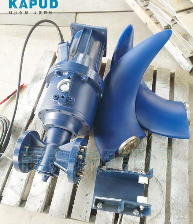 厌氧池搅拌潜水推进器俗称:潜水推流器,低速潜水搅拌机,低速潜水推流器,水下推进器,水下推流器通过电机、减速箱带动叶轮(两叶镰刀式)旋转,产生强烈的推流和搅拌作用,在推动液体前进的同时,对氧化沟(或其它水处理设施)里的混合液进行充分搅拌混合,不仅改善了氧化沟的水流条件,使水体获得工艺所要求的流速,也增加了池底水体的流动和混合,防止污泥的沉积,提高了污水处理效率。