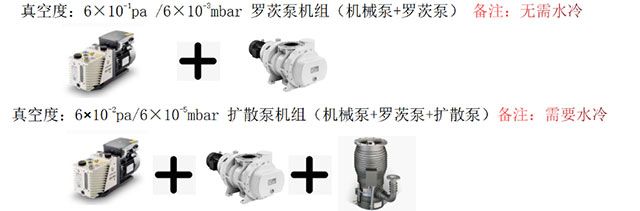 真空度:6×10-1 pa /6×10-3 mbar 罗茨泵机组(机械泵+罗茨泵) 备注:无需水冷