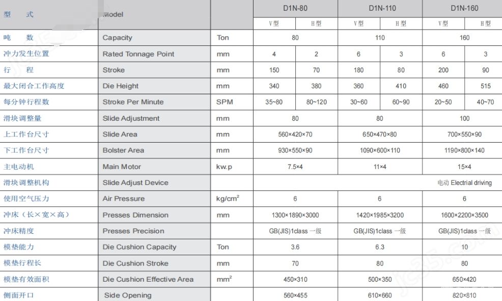 单点半闭式精密冲床D1N系列的参数: