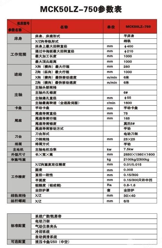 MCK50LZ-750平线轨数控车床采用机电一体化设计,外型美观、结构合理、用途广泛、操作方便,能够自动完成多种金属零件内外圆、端面、切槽、任意锥度球面及各种英制、公制圆柱、圆柱螺纹、粗长轴轴类的加工。