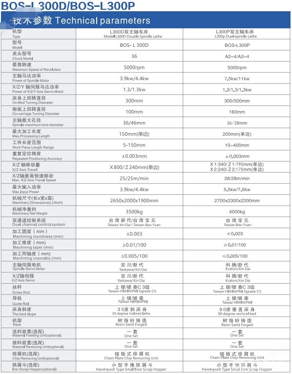 BOS-L300P双主轴数控车床采用双移动主轴,双独立刀架的结构设计,可同时加工工件两端,具有定位精度高, 生产效率高等特点,有效保证工件同心度。同时车床可以选配各式自动送料机和接料机构,实现无人化加工,为企业带来显著效益。