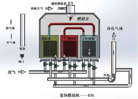 废气流经蓄热室1升温后进入氧化室焚烧,成为净化的高温气体后离开氧化室,进入蓄热室2(在前面的循环中已被冷却),释放热量,降温后排出,而蓄热室2吸收大量热量后升温(用于下一个循环加热废气)。处理后气体离开蓄热室2,经引风机排入大气。一般情况下排气温度比进气温度高约30~50℃左右。