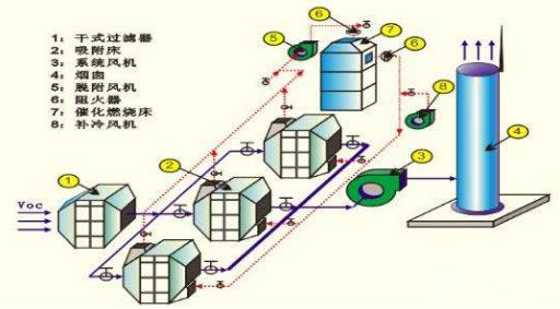吸附气体流程:待处理的有机废气经干法过滤以后,由风管引出后进活性炭吸附床,气体进入吸附床后,气体中的有机物质被活性炭吸附而着附在活性炭的表面,从而使气体得以净化,净化后的气体再通过风机排向大气。