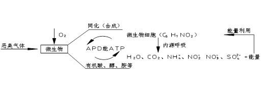 第三阶段:进入微生物细胞的恶臭成分作为营养物质为微生物所分解、利用;从而使污染物得以去除。不含氮的物质分解成CO2和H2O,含硫的恶臭物被氧化成S、SO3、SO4;含氮的恶臭物成分则被氧化成NH4、NO2、NO3