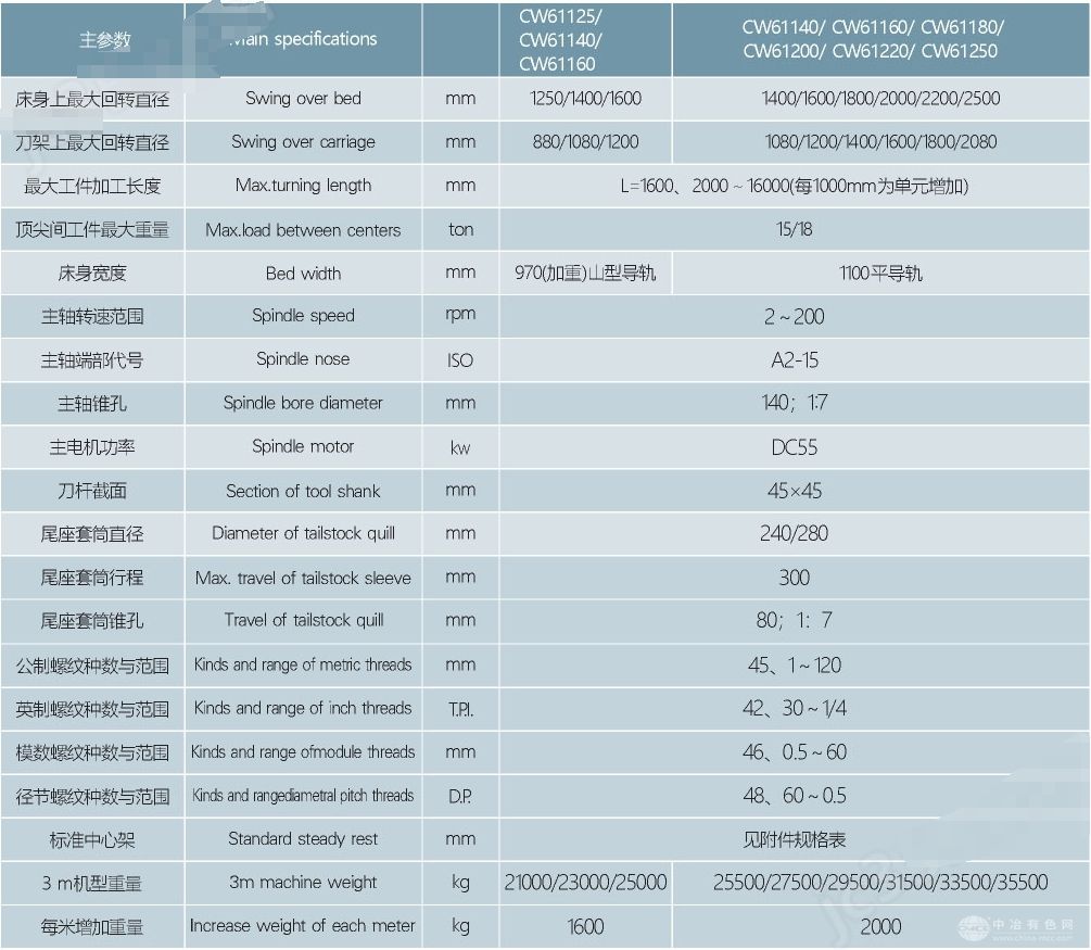 CW61140/CW61160/CW61180/CW61200/CW61220/CW61250大型卧式车床技术参数: