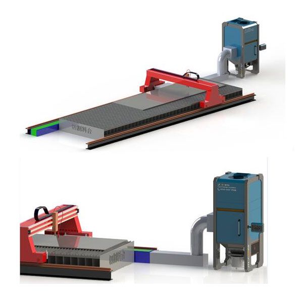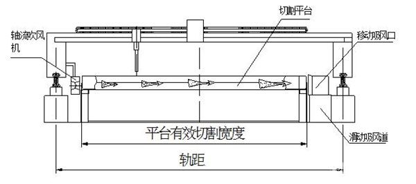 火焰、等离子切割平台要求制作成栅栏风道型,可以有效的治理切割烟尘。其特点是烟尘、粉尘捕捉效率高,粉尘清理方便,初投资小,但其有效切割宽度有所减小,主要适用于龙门式火焰、等离子切割机。该种除尘方式的吸风道非常关键,也是我公司针对切割机除尘开发出的独特产品,其外形如下,其密封性性能良好,结构强度高,密封皮带耐用,吸风小车灵活可靠。