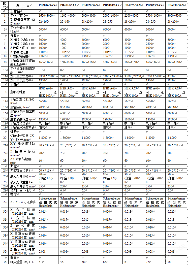 PB五轴/高架式龙门加工中心采用模块化设计,按工作台宽度分为1600、2000mm、2500mm、3000m四大系列,在长度方向有3000、4000、6000mm几种可供用户选择,机床型号分别为PB4020/5AX、PB6020/5AX、PB8020/5AX、PB4025/5AX、PB6025/5AX、PB8025/5AX等。