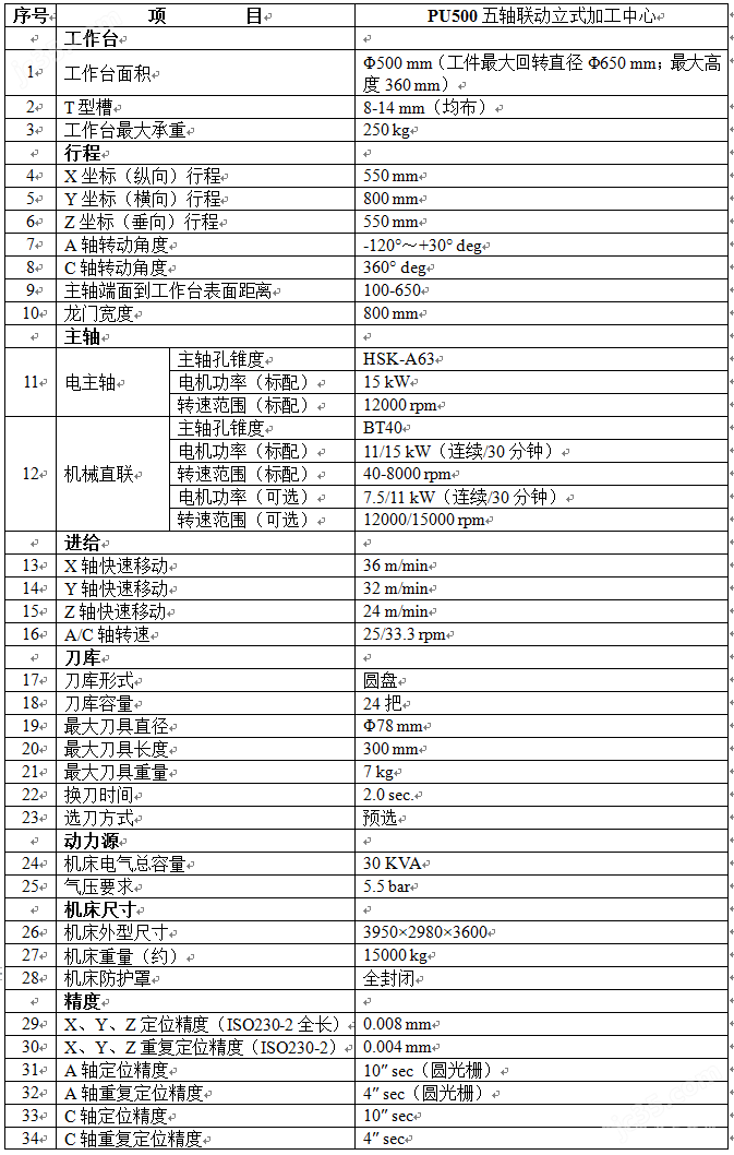 PU500五轴联动立式加工中心是配置FANUC数控系统,搭配A-C摇篮的摇篮五轴加工中心,可实现五轴四联动加工;零件一次装夹可进行零件的镗孔、钻孔、铰孔、攻丝、铣削等数控加工,特别适合航空航天、模具、汽车等精密零件的加工,能达到用略高于国内同类产品价格的投入取得进口设备的效果,具有良好的性能价格比。机床选配光栅尺或线轨一体式磁栅,可形成全闭环控制;选配不同测头可实现刀具和工件测量;选配贯穿主轴冷却功能可实现较深孔的加工等。