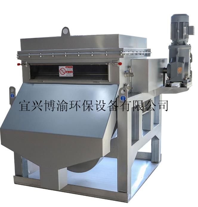 经过高速剪切机后的磁泥混合液进入磁分离器。含有磁粉和污泥的污水从转鼓的一端进入磁分离装置,固定磁极将磁性颗粒吸出并附着在滚筒表面,随着滚筒的转动,被带至磁系边缘的低磁区,并从磁性物质出口卸下,非磁性物质则在重力的作用下,沿分离槽流至非磁性物质出口排出,完成磁性物质和非磁性物质的分离过程。