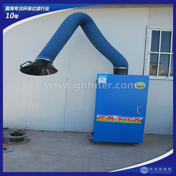 移动式单臂焊烟除尘器GHCQQ-1800用于焊接、抛光、切割、打磨等工序中产生烟尘和粉尘的净化以及对稀有金属、贵重物料的回收等,可净化大量悬浮在空气中对人体有害的细小金属颗粒。该除尘器具有净化效率高、噪声低、使用灵活、占地面积小等特点。通过风机引力作用,焊烟废气经万向吸尘罩吸入设备进风口,设备进风口处设有阻火器,火花经阻火器被阻留,烟尘气体进入沉降室,利用重力与上行气流,首先将粗粒尘直接降至灰斗,微粒烟尘被空气滤芯捕集在外表面,洁净气体经滤芯过滤净化后,由滤芯中心流入洁净室,洁净空气又经活性碳过滤器吸附进一步净化后经出风口达标排出。