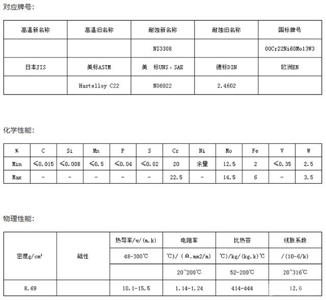 GH3308是以C276为基础提高了合金铬含量并降低了钼和钨,其中碳和矽含量极低,是了达到改进C4和C276的强氧化介质腐蚀。虽然提高了氧化介质耐腐蚀性能,但是耐点蚀和耐缝隙腐蚀未明显改善。具有优异的抗应力腐蚀开裂能力和好的耐局部服饰能力,在很多化工工艺介质中有满意的耐蚀特性,由于此合金含碳和矽极低,因此,非常适宜制造化学工业中耐腐蚀焊接设备、容器、管线,而没有敏化的危险。合金在焊接热影响区有抵抗晶界沉淀形成的能力,这样使它在焊接状态下也能适应很多种化工过程的应用。