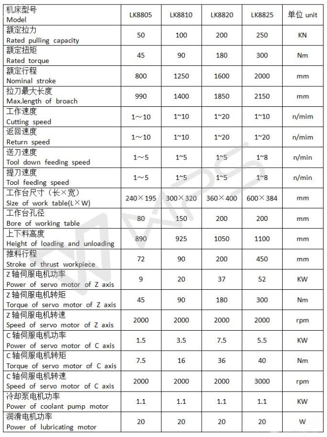 本机床采用FANUC伺服机械传动,工作平稳,能无级调速;机床的工作台与主滑板为整体式,由伺服电机和滚珠丝杆带动上、下移动实现拉削,机床在拉削运动Z轴上利用光栅尺,在旋转运动C轴上使用双蜗轮蜗杆和角度编码器,有效保证了机床的运行精度,其工效可提高10倍以上。