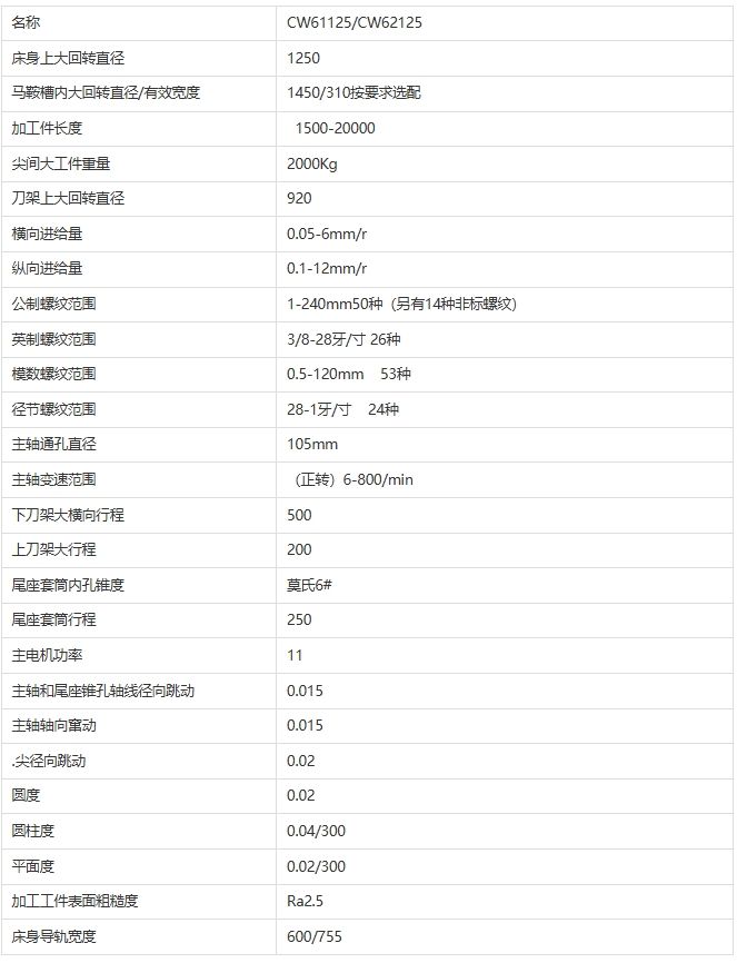 CW61125车床功率大、刚性强、主轴调速范围广,适用于强力或高速切削,可以车削端面、外圆、肉孔以及公制、英制、模数、径节各种螺纹,并可承担钻孔、套料、镗孔等工艺。