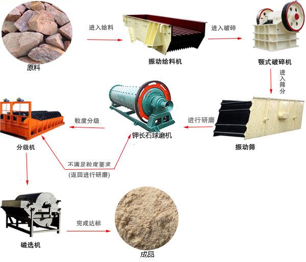 给料机送入钾长石球磨机内,物料经过钾长石球磨机的研磨达到标准的粒度后,由螺旋输送机送入选粉机内,进行分级,获得不同粒级的产品。整个工艺流程的重中之重是制粉设备,制粉设备选用钾长石球磨机,优势十分明显:产量大、磨粉效率高、一次吞吐量大、设备维修率低,在钾长石生产加工线上应用广泛。