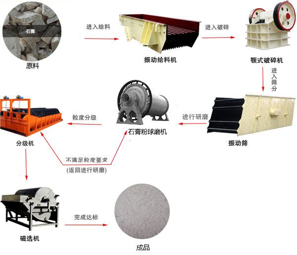 石膏粉物料进入石膏粉球磨机筒体研磨,经石膏粉球磨机研磨后物料中含有大量细灰,再次由提升机喂入选粉机分选,分选出的细灰经后续输送设备送入成品灰库,专用石膏粉球磨机尾部配有收尘系统进行收尘,采用此种闭路研磨工艺与开路(无选粉机)系统相比可提高台时产量百分之四十以上,是石膏粉磨细深加工的设备。