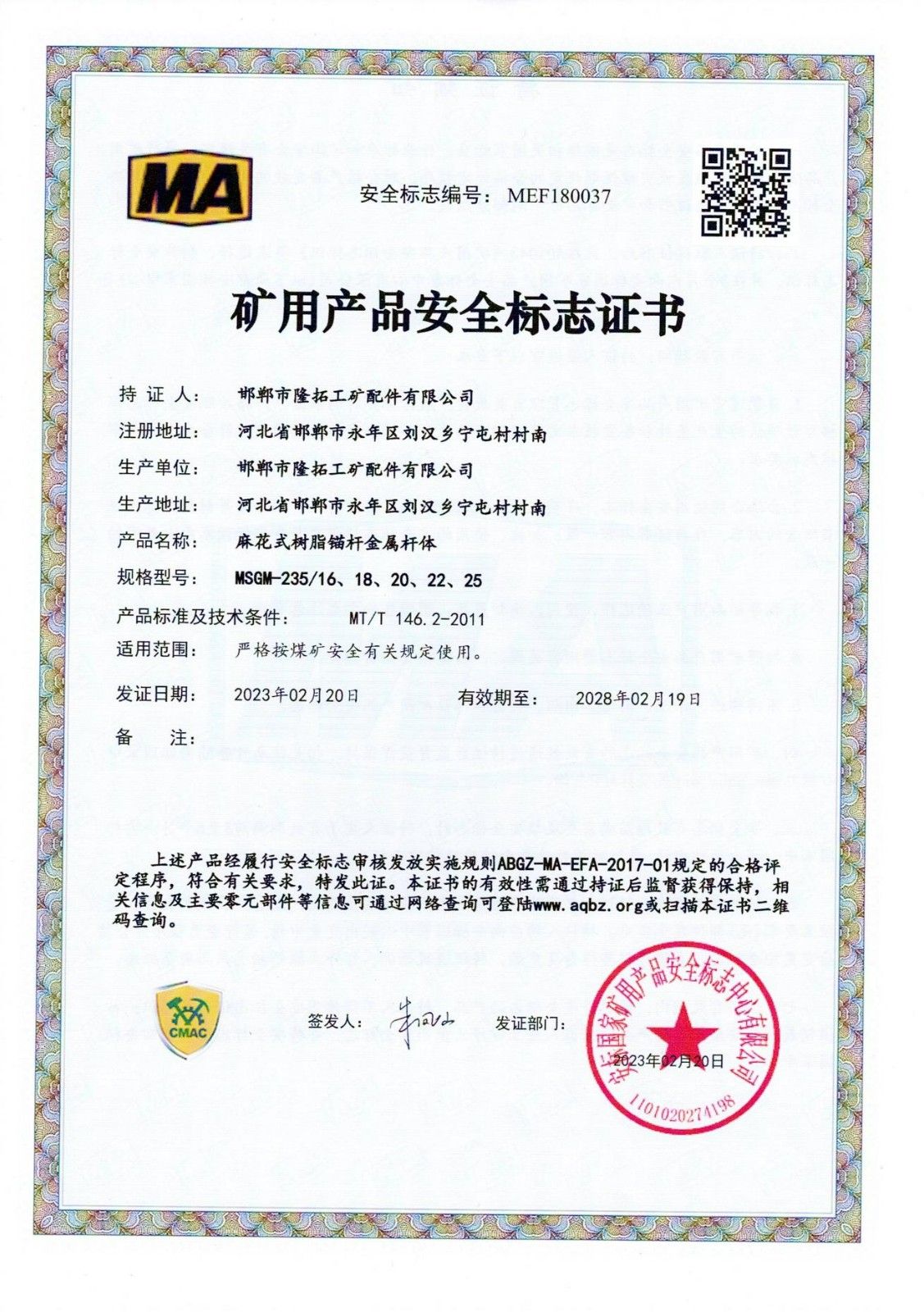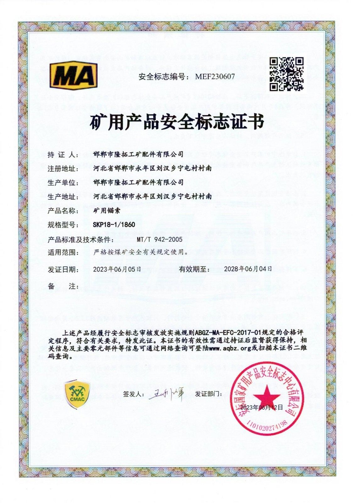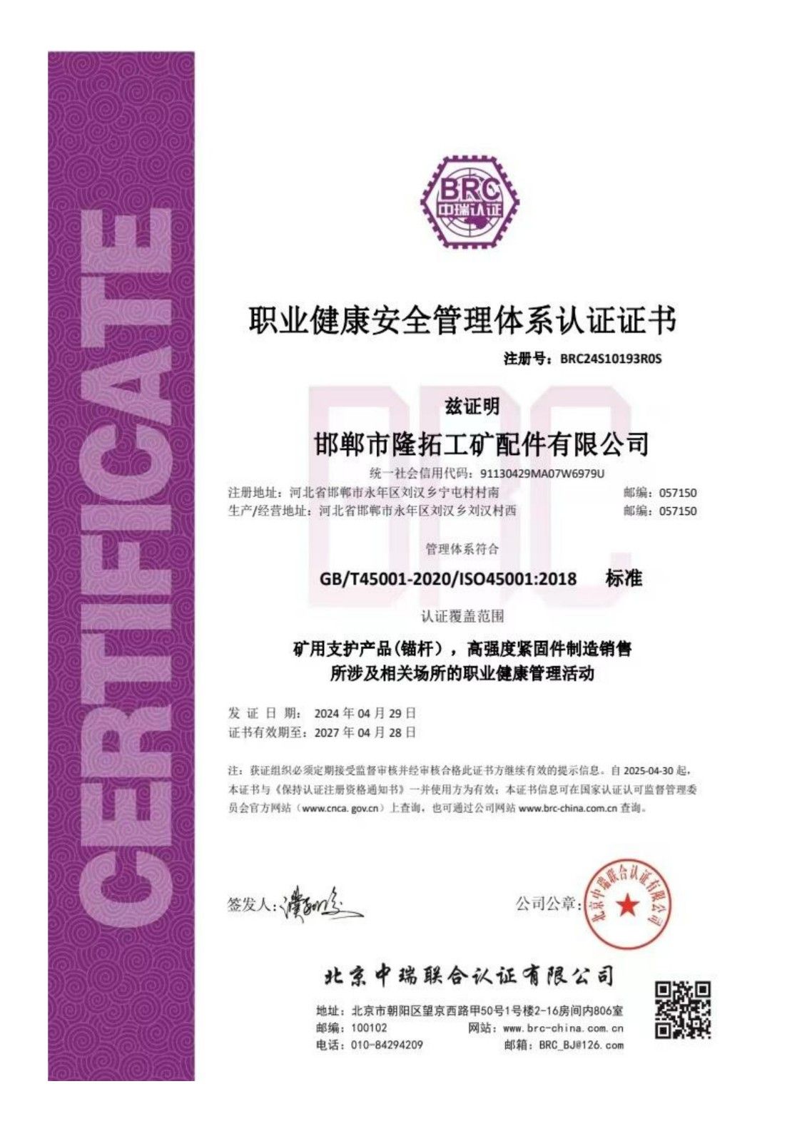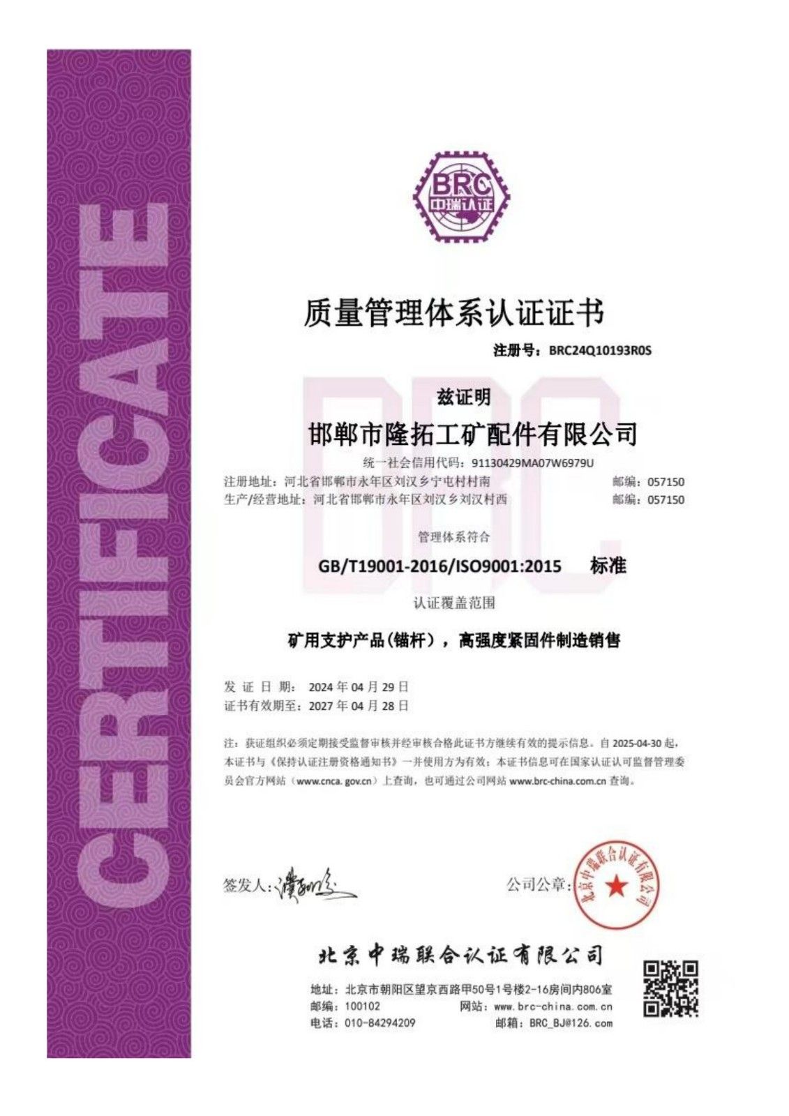 公司被认为:规上工业企业,永年县标准件协会会员单位,荣获国家矿用安全产品标志证书,3A级信用企业,ISO9001质量管理体系证书,ISO14001环境管理体系证书,以及ISO45001职业健康安全管理证书,多次被誉为永年县标准件行业诚信单位等,光荣称号。公司始终坚持“以人为本,以市场为核心”的原则,不断引进和培养高素质的专业人士,借鉴国内外成功的管理经验,并且积极吸引和引进领先技术的专业设备,现已发展成为集生产、销售、仓储、加工配送于一体的专业高新企业。我们真诚欢迎各界朋友联系洽谈指导,提高优质服务!真诚期待与您合作!咨询电话13165506017
