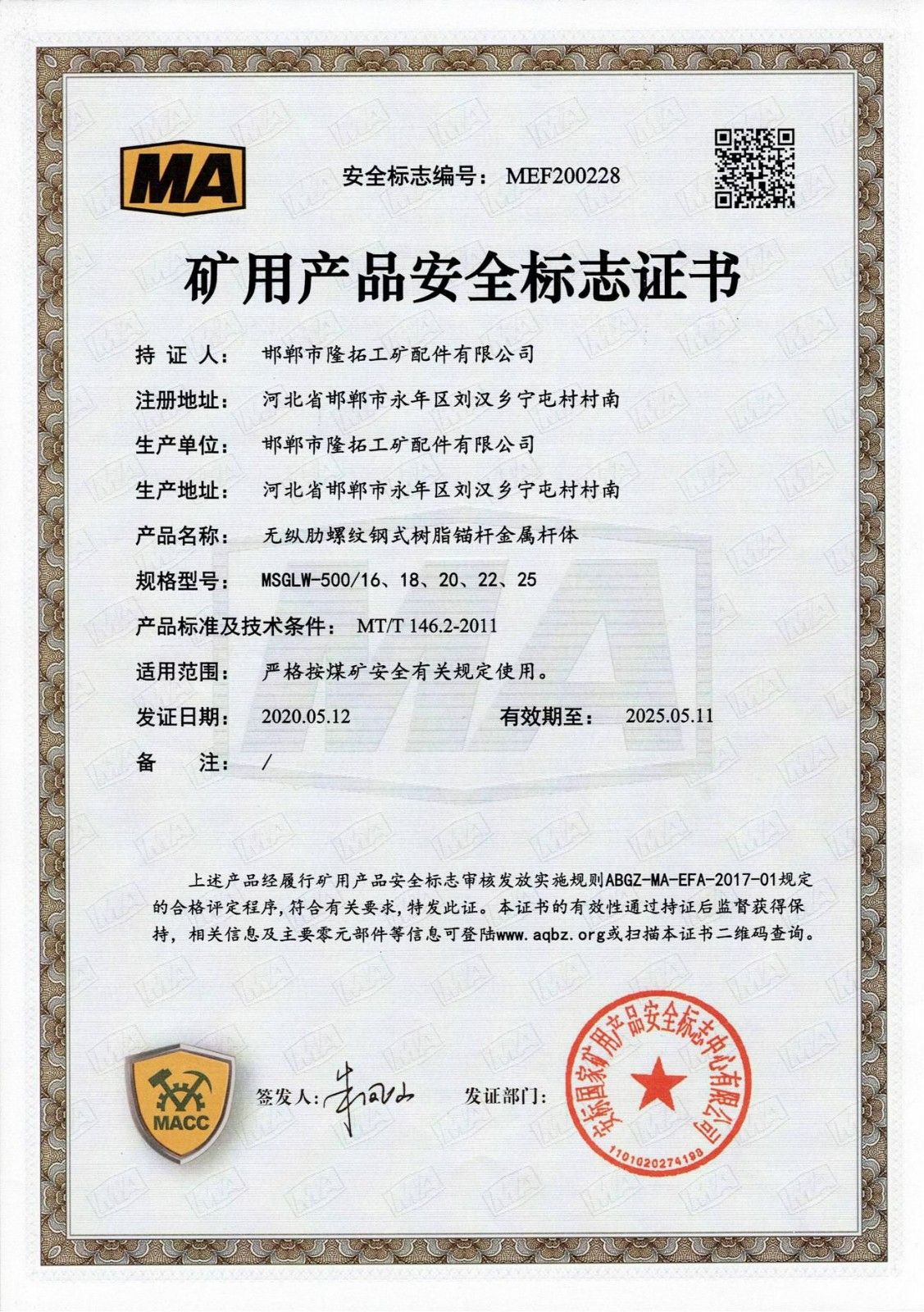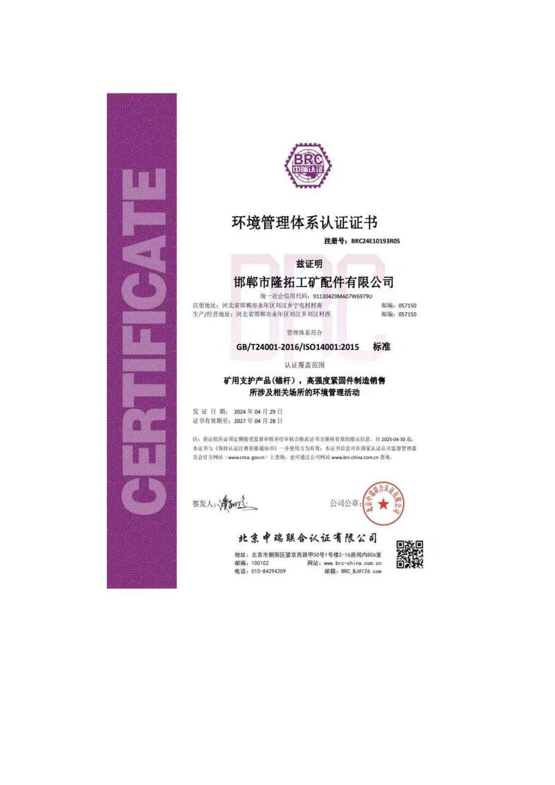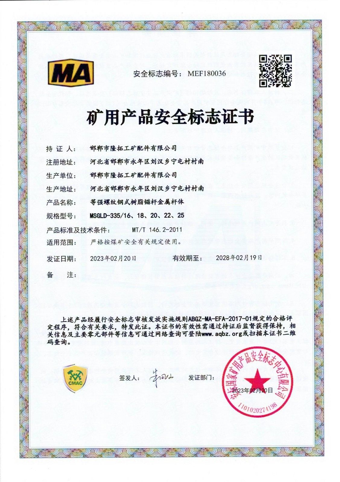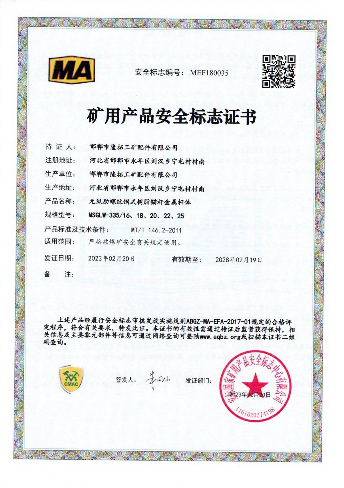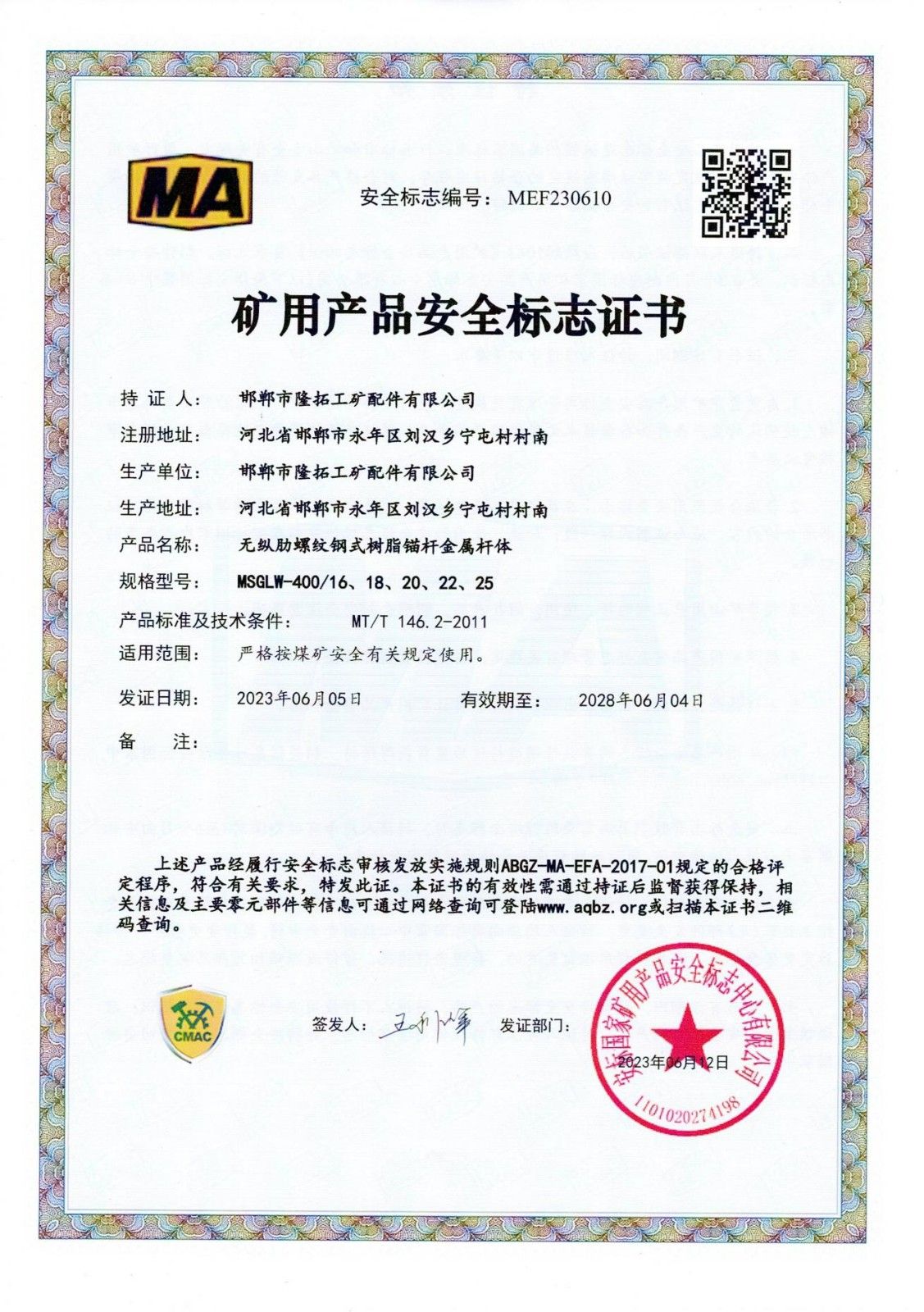公司被认为:规上工业企业,永年县标准件协会会员单位,荣获国家矿用安全产品标志证书,3A级信用企业,ISO9001质量管理体系证书,ISO14001环境管理体系证书,以及ISO45001职业健康安全管理证书,多次被誉为永年县标准件行业诚信单位等,光荣称号。公司始终坚持“以人为本,以市场为核心”的原则,不断引进和培养高素质的专业人士,借鉴国内外成功的管理经验,并且积极吸引和引进领先技术的专业设备,现已发展成为集生产、销售、仓储、加工配送于一体的专业高新企业。我们真诚欢迎各界朋友联系洽谈指导,提高优质服务!真诚期待与您合作!咨询电话13165506017