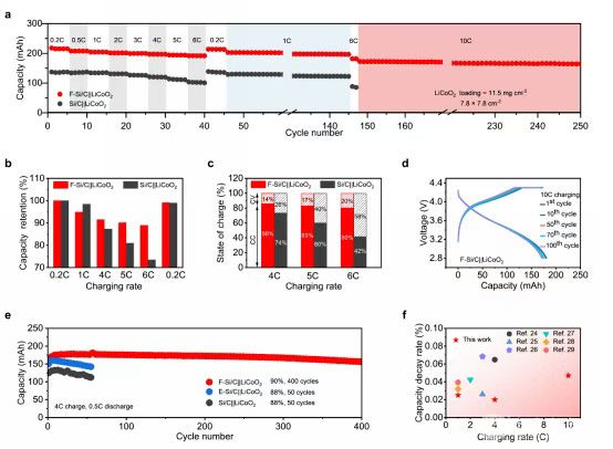 图3. FEC 介导预锂化 Si/C 电极的快充性能