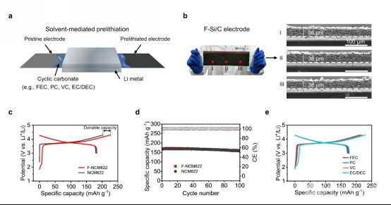图5 (a)溶剂介导的接触预锂化过程示意图。(b) 大尺度F-Si/C电极的数码照片和不同位置的截面SEM图像。(c、d)采用FEC预锂化后NCM622电极在0.1 C倍率下的首圈充放电曲线和0.5 C倍率下的循环性能。(e)采用不同环状碳酸盐溶剂进行接触预锂化后NCM622电极的首圈充放电曲线