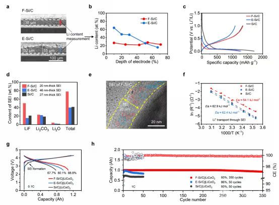 图2 (a) F-Si/C和E-Si/C电极的横截面SEM图像。(b)F-Si/C和E-Si/C电极的锂原子含量-电极深度图。(c)F-Si/C、E-Si/C和Si/C电极的首圈充放电曲线。(d)活化后F-Si/C、E-Si/C和Si/C电极各SEI组分的含量。(e)活化后F-Si/C的高分辨TEM图像。(f) F-Si/C、E-Si/C和Si/C电极的活化能比较。(g、h)使用F-Si/C, E-Si/C和Si/C负极与LiCoO2正极组装1.2 Ah软包电池,在0.1 C时的首圈充放电曲线和相应的循环性能。