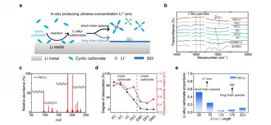 图4(a)锂金属与环状碳酸盐溶剂原位反应生成低浓度Li+离子示意图。(b)各种环状碳酸酯溶剂与锂金属反应溶液的FTIR光谱。(c)FEC与锂金属反应溶液的质谱。(d)烷基碳酸锂在不同溶剂中的解离度及不同溶剂的分子极性指数。(e)FEC与锂金属反应生成的烷基碳酸锂的结构计算