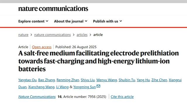 孙永明教授课题组开发了一种以环状碳酸酯(如氟代碳酸乙烯酯 FEC等)为介质的无盐接触预锂化策略。该介质无需添加锂盐,通过与金属锂自发反应原位生成mM级锂离子,可在电极深度方向实现锂离子扩散与材料本征反应速率的精细平衡,达成时空均匀的预锂化。这种方法不仅能有效补偿硅基负极的初始锂损失,还能构建具有优异锂离子传输性能的富无机固体电解质界面(SEI)。基于此技术组装的安时(Ah) 级叠片 Si/C||LiCoO2软包电池的能量密度相较于未预锂化的电池提升 42.7%,在 10 C (6 min)快充条件下实现 80.9% 的容量利用率,且循环过程中容量衰减率低至 0.047% / 循环。这种预锂化方法在各种环状碳酸酯介质、电极中表现出通用性,并且具有工业应用的可扩展性,为高能量密度锂离子电池的发展提供了新思路。相关研究成果以“A salt-free medium facilitating electrode prelithiation towards fast-charging and high energy lithium-ion batteries”为题发表在Nature Communications上。