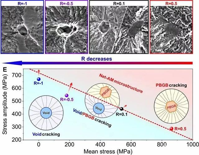 图2.Net-AM组织Ti-6Al-4V合金在不同应力比下的典型疲劳断口和对应的疲劳裂纹萌生机制。(A)应力比R=-1:微孔缺陷开裂;(B)应力比R=-0.5:微孔缺陷开裂;(C)应力比R=0.1:微孔缺陷开裂和显微组织开裂共存;(D)应力比R=0.5:显微组织开裂;(E)应力比变化,Net-AM组织Ti-6Al-4V合金疲劳裂纹萌生位置转变及其对应的疲劳强度变化示意图