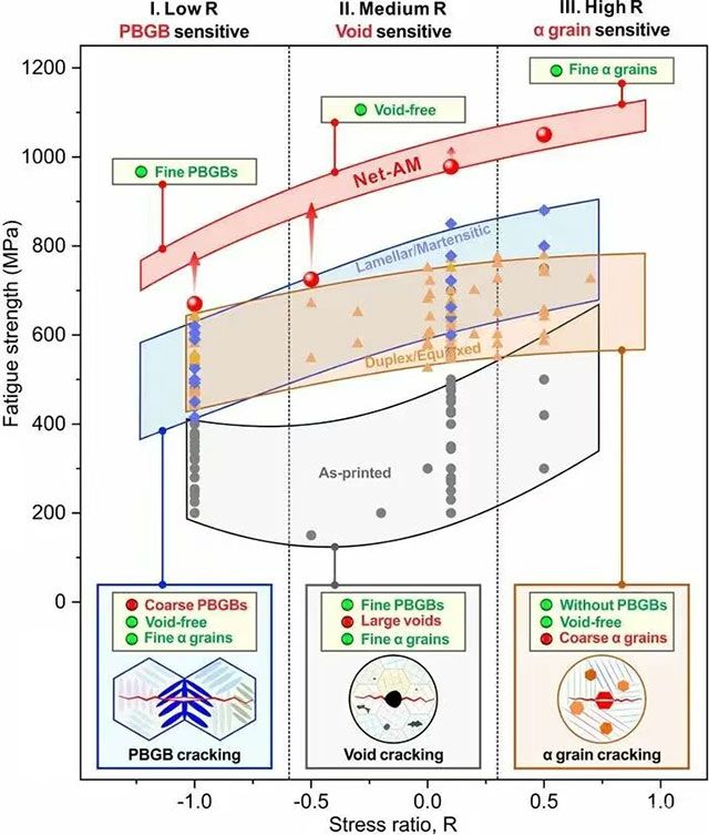 然而,实际工程构件的服役环境一般非常复杂,常常伴随着加载应力比的显著变化。当材料或构件所承受的外部应力比变化时,循环应力幅值和最大应力的分配比例也随之改变,进而诱发不同疲劳开裂机制之间的转变。这种“此消彼长”的开裂规律使得传统钛合金组织难以在全应力比范围内均保持优异的疲劳性能,一种显微组织类型往往仅在特定应力比范围内表现出抗疲劳优势(图1)。尤其是对于具有复杂结构的增材制造构件,其实际服役过程中的应力分布更为复杂,不可避免地会承受具有多变应力比的疲劳载荷。因此,如何实现全应力比条件下的高抗疲劳能力是决定增材制造技术能否在航空航天等领域规模化应用的关键,也是亟待解决的科学难题之一。