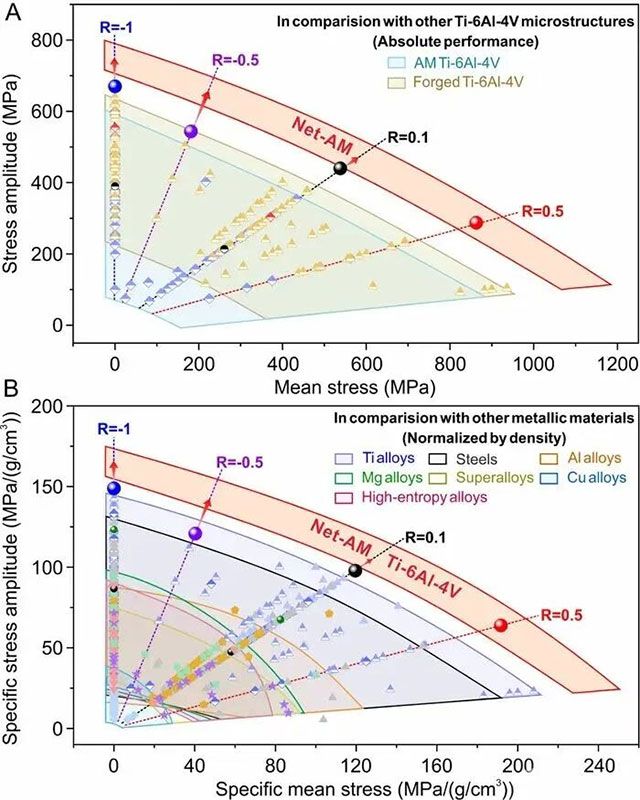 图3.与其他Ti-6Al-4V合金和常见的金属结构材料相比,Net-AM组织Ti-6Al-4V合金在不同应力比下的疲劳强度分布。(A)应力幅vs平均应力;(B)材料密度归一化的疲劳强度vs材料密度归一化的平均应力