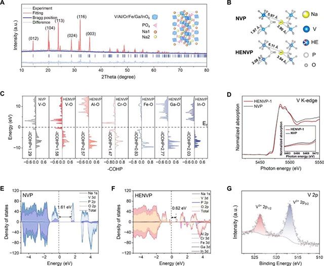 【图文解析】图1. HENVP-1的结构模拟与表征。(A) HENVP-1的XRD精修及其晶体结构;(B) NVP与HENVP-1的局部放大对比;(C) NVP与HENVP-1中不同键的-ICOHP值;(D) NVP与HENVP-1的V K边XANES谱;(E, F) NVP与HENVP-1的总态密度及分波态密度;(G) HENVP-1的V 2p XPS拟合谱。
