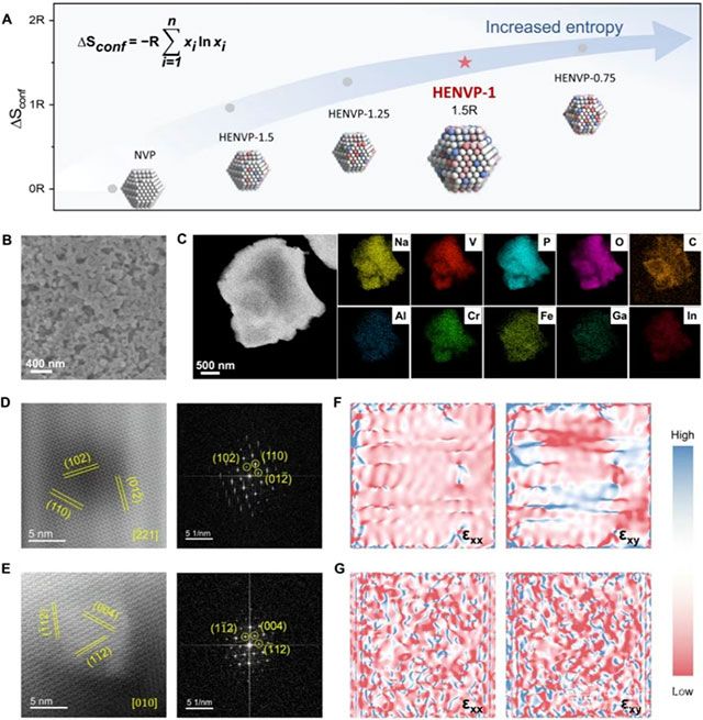 图2. HENVP的合成与形貌表征。(A) 不同熵值HENVP的设计示意图;(B) HENVP-1的SEM图像;(C) HENVP-1的HAADF-STEM图及相应EDS元素分布;(D, E) 沿[221]和[010]晶轴方向的HRTEM图像及FFT衍射图;(F, G) HENVP-1的原子应变分布。