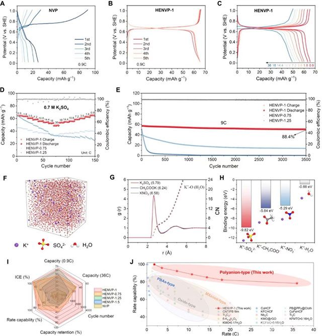 图3. APIBs电化学性能。(A, B) NVP与HENVP-1在0.9C下的充放电曲线;(C) HENVP-1在不同倍率下的充放电曲线;(D) 不同HENVP样品的倍率性能;(E) HENVP-1在9C下的循环性能;(F) 0.7 M K2SO4电解液的MD模拟快照;(G) 不同电解液中K+–O的径向分布函数与配位数;(H) K+与不同阴离子及H2O的结合能;(I) 所有样品电化学性能雷达图;(J) HENVP-1与已报道APIBs正极材料的倍率性能对比。