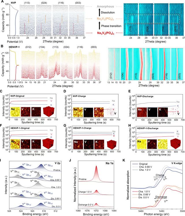 图4. K+存储机制与结构演化。(A, B) NVP与HENVP-1的原位XRD谱;(C–E) NVP与(F–H) HENVP-1在不同状态下的TOF-SIMS深度剖析、元素分布及3D图像;(I, J) HENVP-1在不同状态下的V、Na的非原位XPS谱;(K) HENVP-1在充放电状态下的非原位XAFS谱。