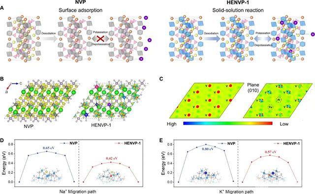 图5. 电子结构与离子迁移能垒分析。(A) NVP与HENVP-1的钾存储机制示意图;(B, C) NVP与HENVP-1的3D与2D差分电荷密度;(D, E) Na+与K+在NVP和HENVP-1中的迁移路径及能垒。