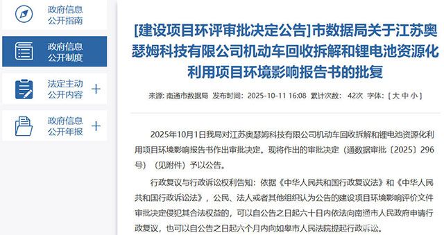 近日,南通市数据局正式发布《关于江苏奥瑟姆科技有限公司机动车回收拆解和