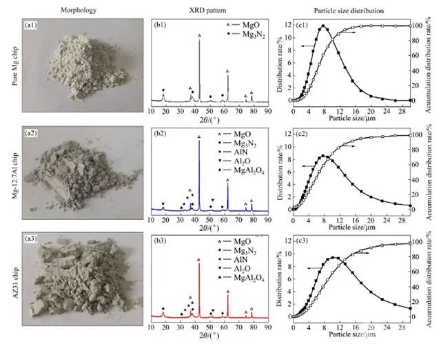 图1所示为纯Mg、Mg-12.7Al和AZ31合金镁屑的燃烧产物形貌、XRD衍射图谱和粒径分布。从XRD结果来看,通过燃烧镁屑的方式获得了氧化物和氮化物夹杂颗粒。在纯Mg镁屑燃烧粉末产物中,可以观测到对应于MgO和Mg3N2物相的衍射峰。在Mg-12.7Al和AZ31合金镁屑燃烧粉末产物中,观测到对应于MgO、Mg3N2、AlN、Al2O和MgAl2O4物相的衍射峰。从衍射峰强度占比来看,三种镁屑燃烧粉末产物以MgO为主。从粒径统计结果来看,三种镁屑燃烧粉末粒径分布主要集中在1-14μm。图1 纯Mg 镁屑、Mg-12.7Al镁屑和AZ31镁屑燃烧产物形貌、XRD 谱和粉末粒径分布