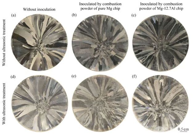 图2所示为纯Mg和Mg-12.7Al镁屑燃烧粉末孕育纯Mg的晶粒形貌。对于未经孕育处理的纯Mg,晶粒呈现为粗大柱状晶形貌。经过纯Mg和Mg-12.7Al镁屑燃烧粉末孕育处理后,未表现出有效的晶粒细化效果。经过熔体超声处理,纯Mg及孕育处理纯Mg晶粒也表现为粗大柱状晶形貌。总体来看,纯Mg和Mg-12.7Al镁屑燃烧粉末孕育处理对纯Mg的晶粒不具有明显细化效果。图2 纯Mg和Mg-12.7Al镁屑燃烧粉末孕育处理纯Mg晶粒形貌