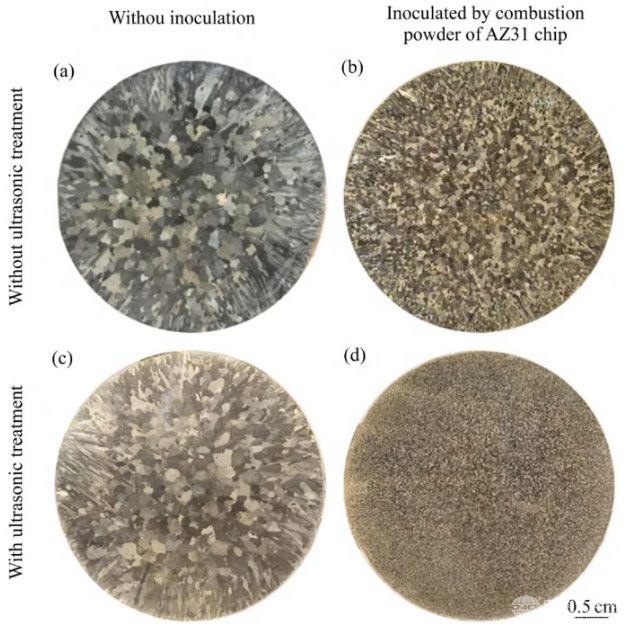 (1)镁屑燃烧粉末孕育处理可有效细化Mg-Al系合金。其中,Mg-3Al合金的平均晶粒尺寸从739μm下降至280μm。镁屑燃烧粉末的主要成分为MgO,可作为a-Mg晶粒的有效异质晶核,在凝固过程中为a-Mg提供异质形核基底。(2)镁屑燃烧粉末孕育处理无法有效细化纯Mg,原因在于缺少溶质元素引起的生长抑制作用和额外的成分过冷度,引入的MgO晶核无法被激活成核。(3)采用超声协同孕育处理,使镁屑燃烧粉末孕育细化效果得到提升。其中,孕育处理Mg-3Al合金的平均晶粒尺寸从280μm下降至191μm,主要与氧化物夹杂颗粒的分散性提升有关。